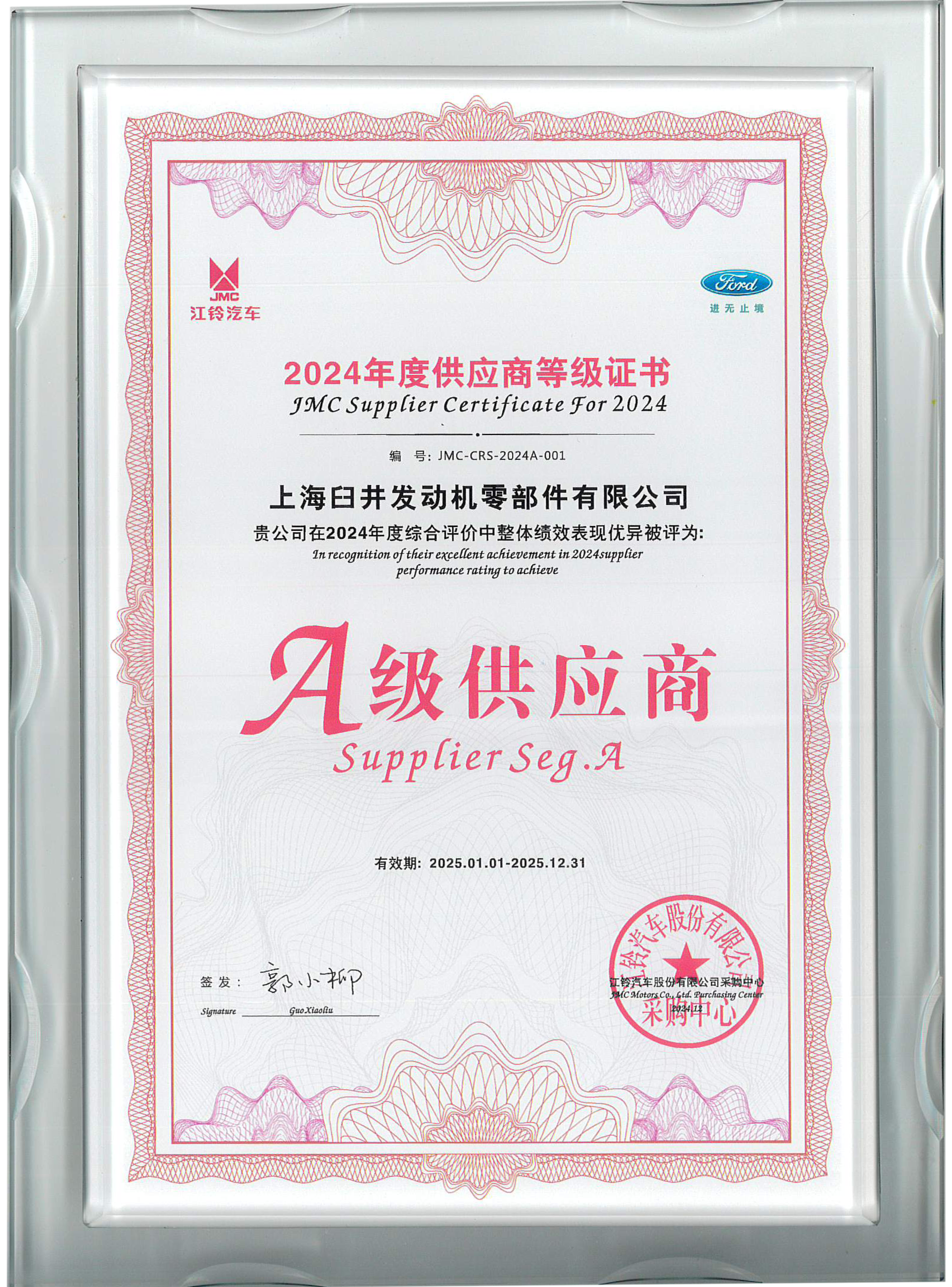 江鈴汽車授予 上海臼井公司"2024年度供應(yīng)商等級"證書,評為“A級供應(yīng)商”。